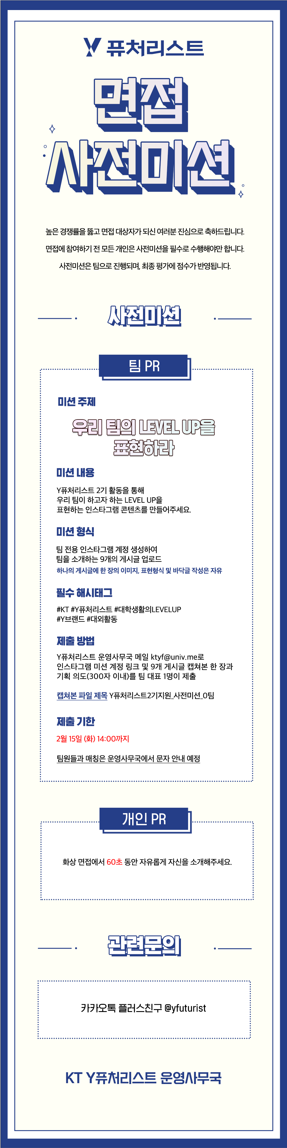 KT Y퓨처리스트는 1차 서류전형, 2차 다대다 화상 면접전형으로 진행됩니다.