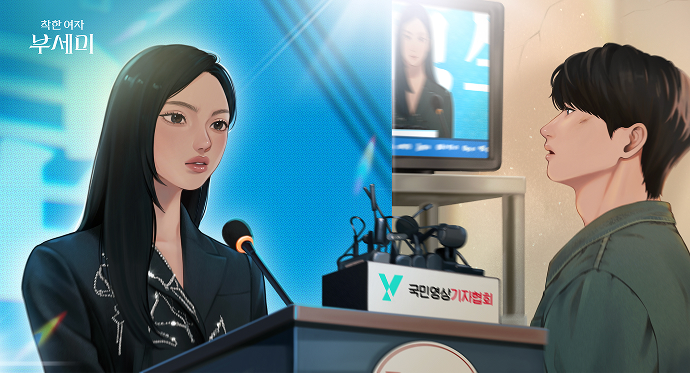 기자회견을 하는 영란과 뉴스 속 그녀를 바라보는 동민