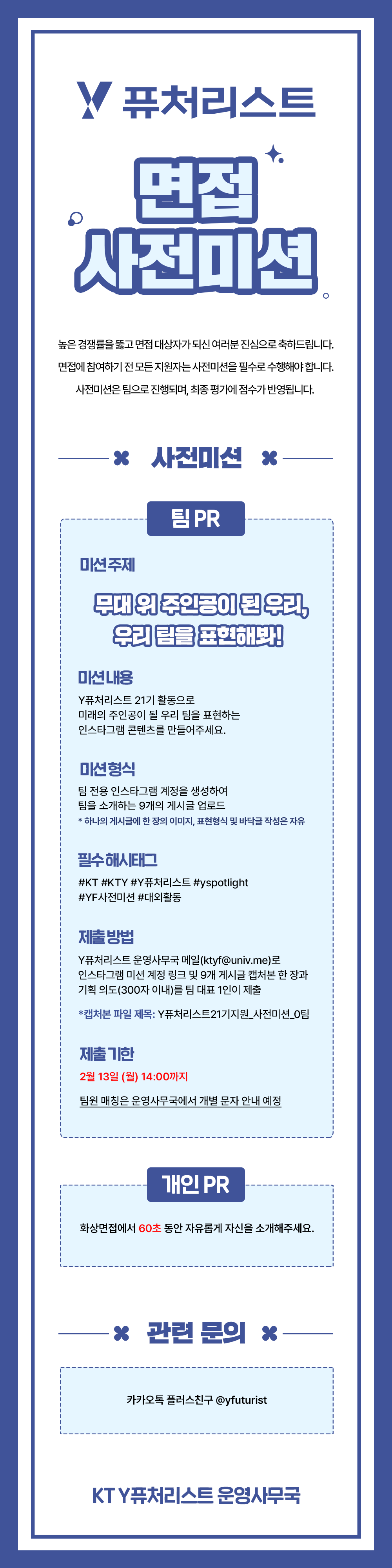 KT Y퓨처리스트는 1차 서류전형, 2차 다대다 화상 면접전형으로 진행됩니다.